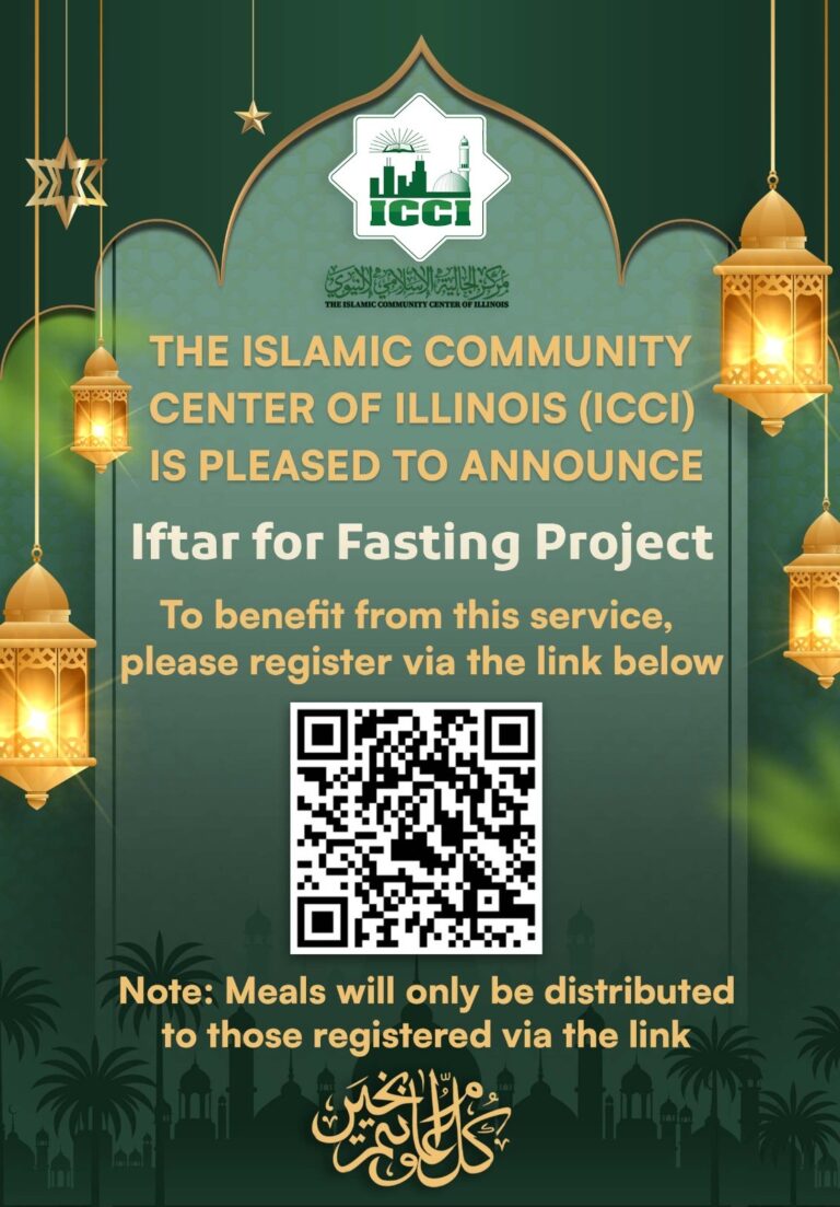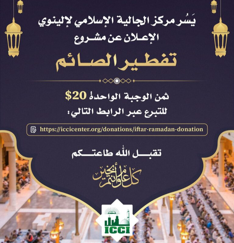 يسُر مركز الجالية الإسلامي لإلينوي ICCI الإعلان عن مشروع ( تفطير الصائم ) ثمن الوجبة الواحدة 20$ للتبرع عبر الرابط التالي : https://iccicenter.net/donations/iftar-ramadan-donation كمان وبإمكانكم